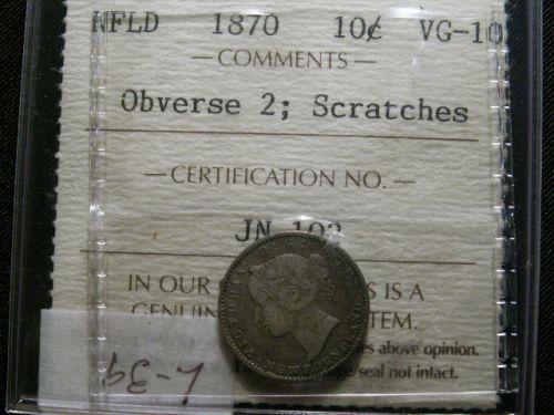 Newfoundland 1870 Obv. 2 10¢ ICCS VG10, key date. Original silver gray tone with usual weakness at centre on reverse. Some old scratches.