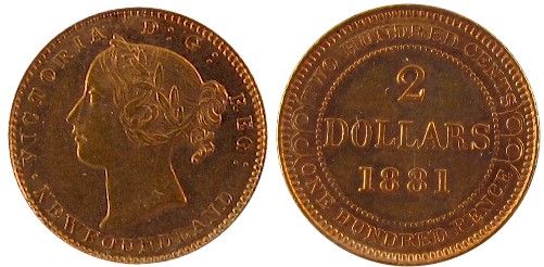 Newfoundland 1881 2 Dollars, ICCS AU58; Gold.