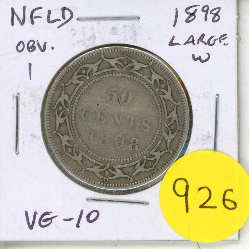 Newfoundland. 1898 Obverse 1 Silver 50 Cents. Large W in NEWFOUNDLAND. Victoria. VG-10.