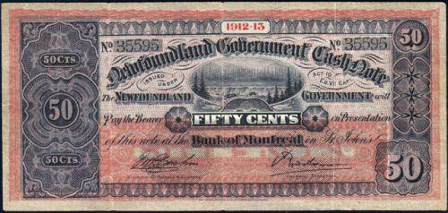Government of Newfoundland 1912-13 Cash Note, CH NF-9c, Serial Number 35595, VF+ with a small pinhole. A nicely firm and bright example with two heavy creases
