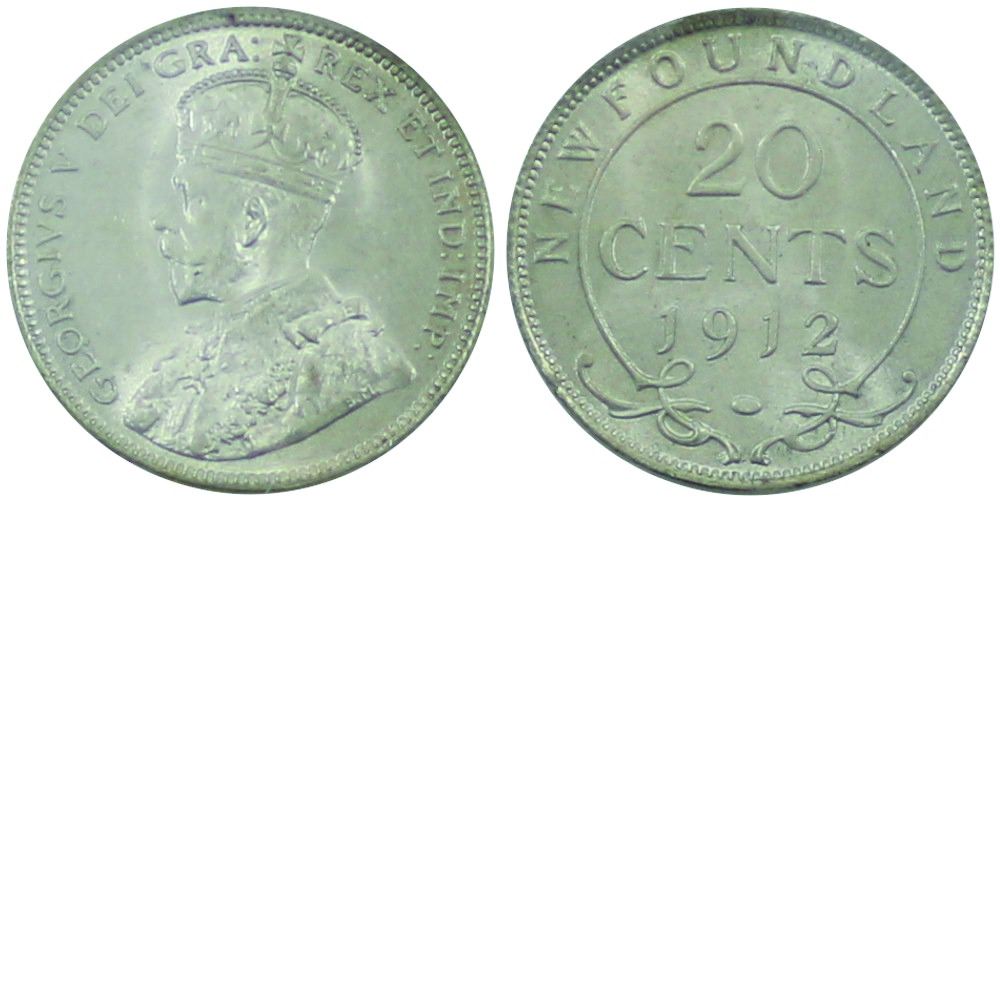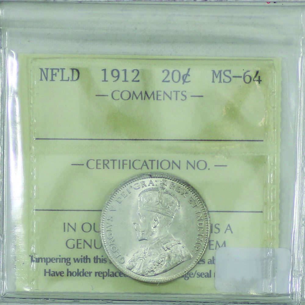 Newfoundland 1912 20-cent ICCS certified MS-64! An exceptionally Lustrous coin with a Low POP in Mint state!