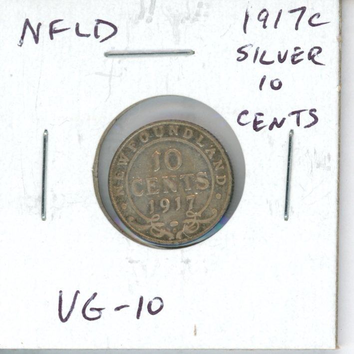 Newfoundland 1917c Silver 10 Cents. Minted in Ottawa because of World War I. VG-10.