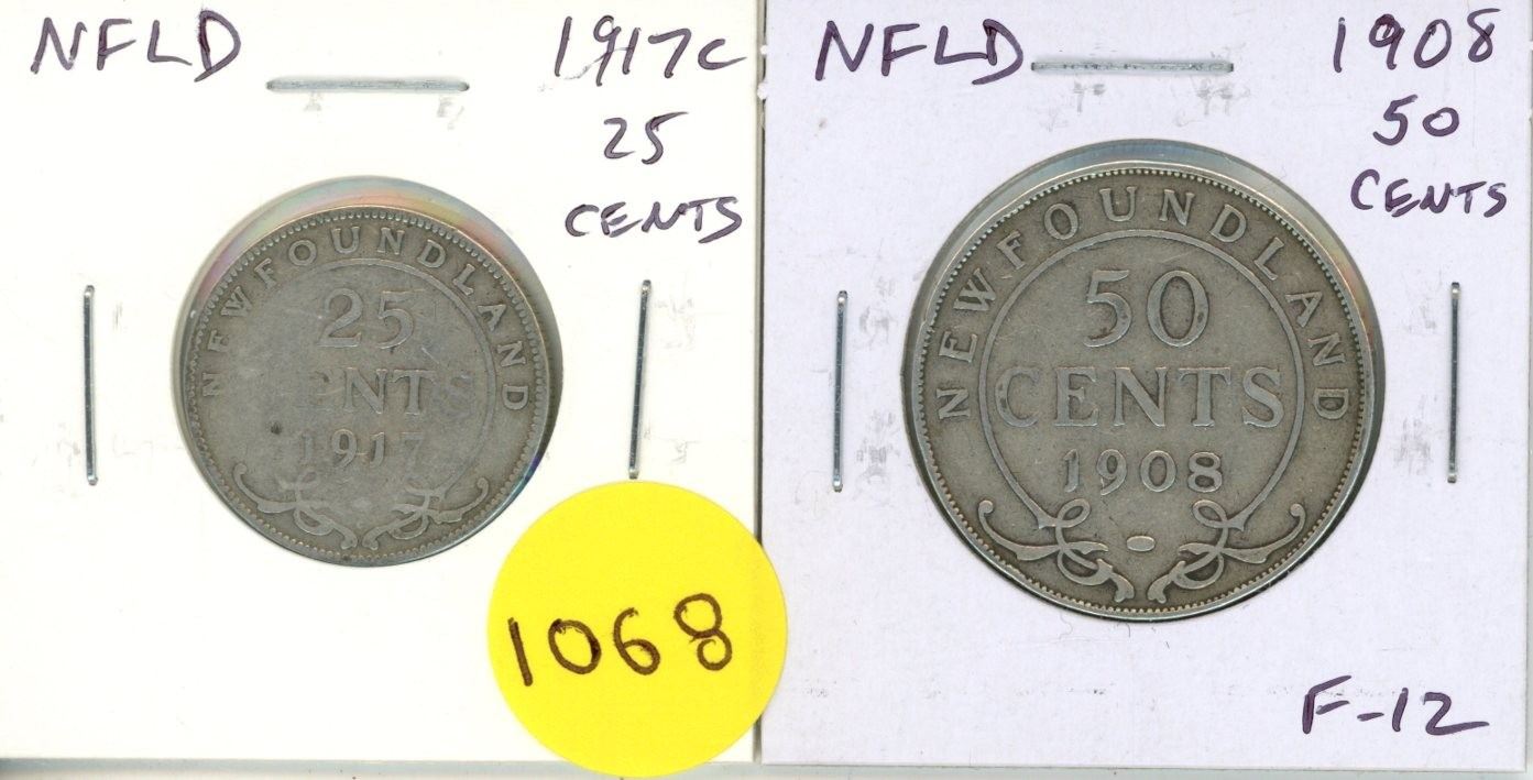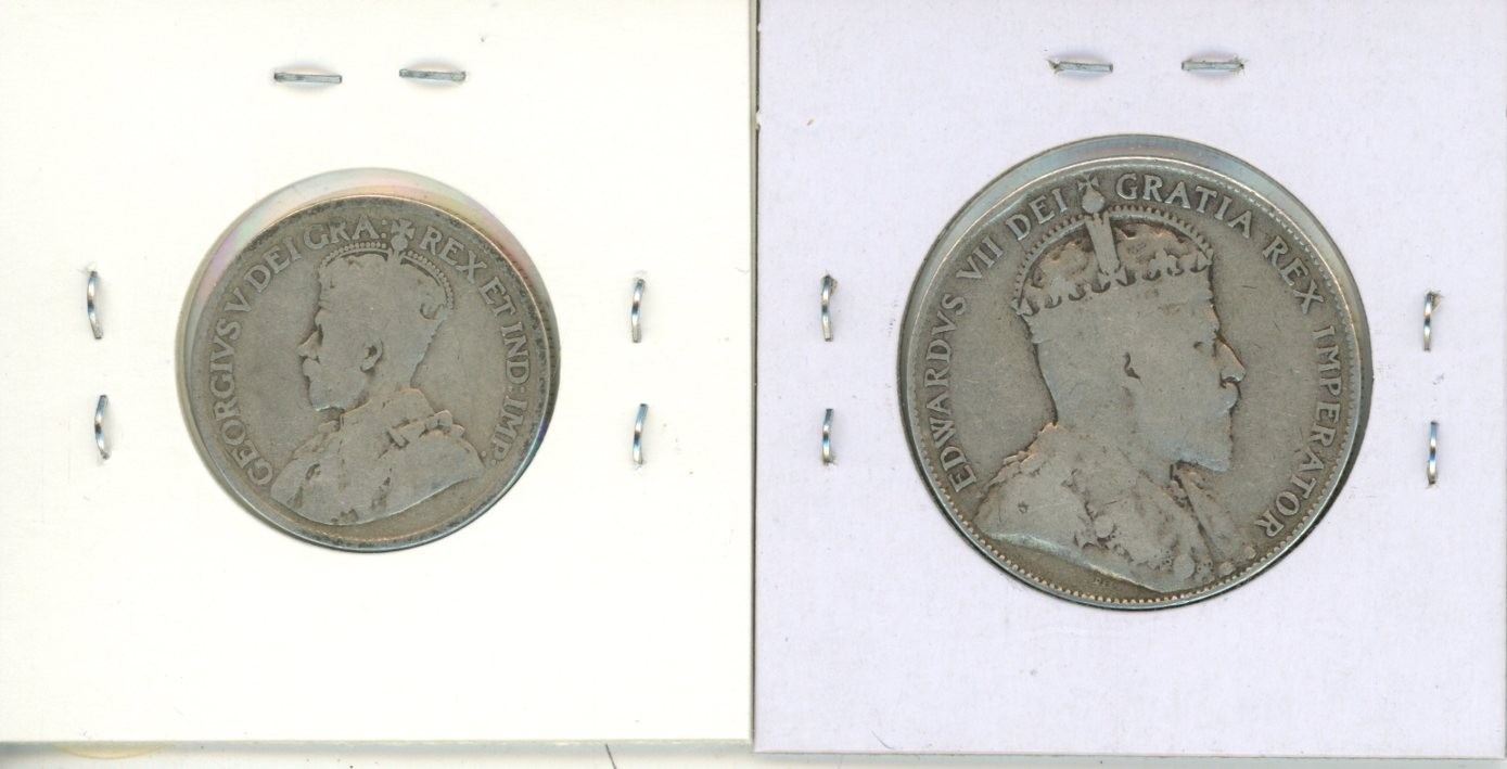 Newfoundland. 1917c Silver 25 Cents. The first of two 25 Cents issued, and the only one minted during World War I. G-6 and Newfoundland. 1908 50 Cents. King Edward VII. F-12.