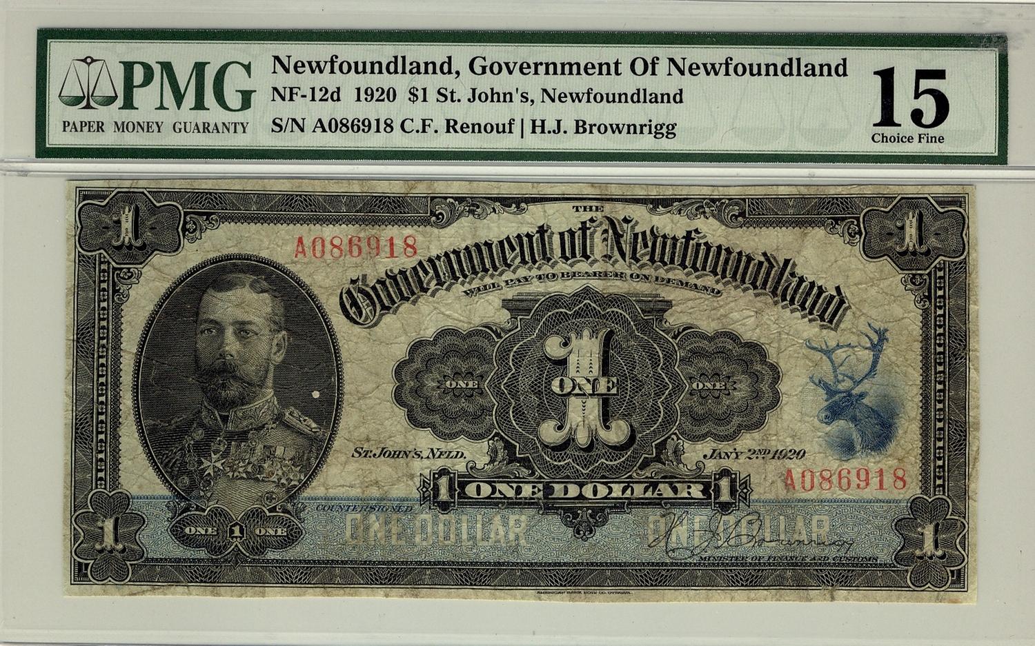 Newfoundland, 1920 $1 #A086918, NF-12d, PMG CH F15.