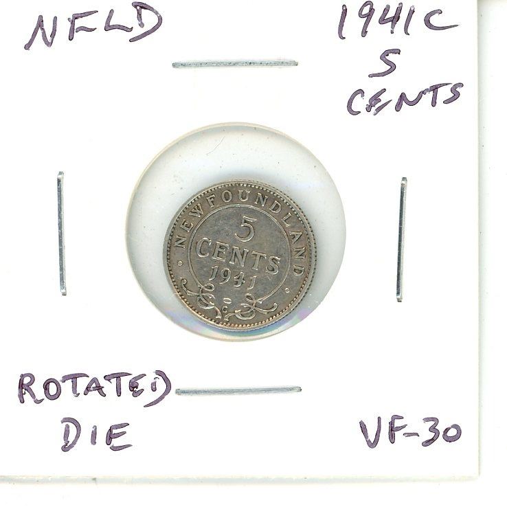 Newfoundland. 1941c Silver 5 Cents. Minted in Ottawa because of World War II. VF-30 with Rotated Die.