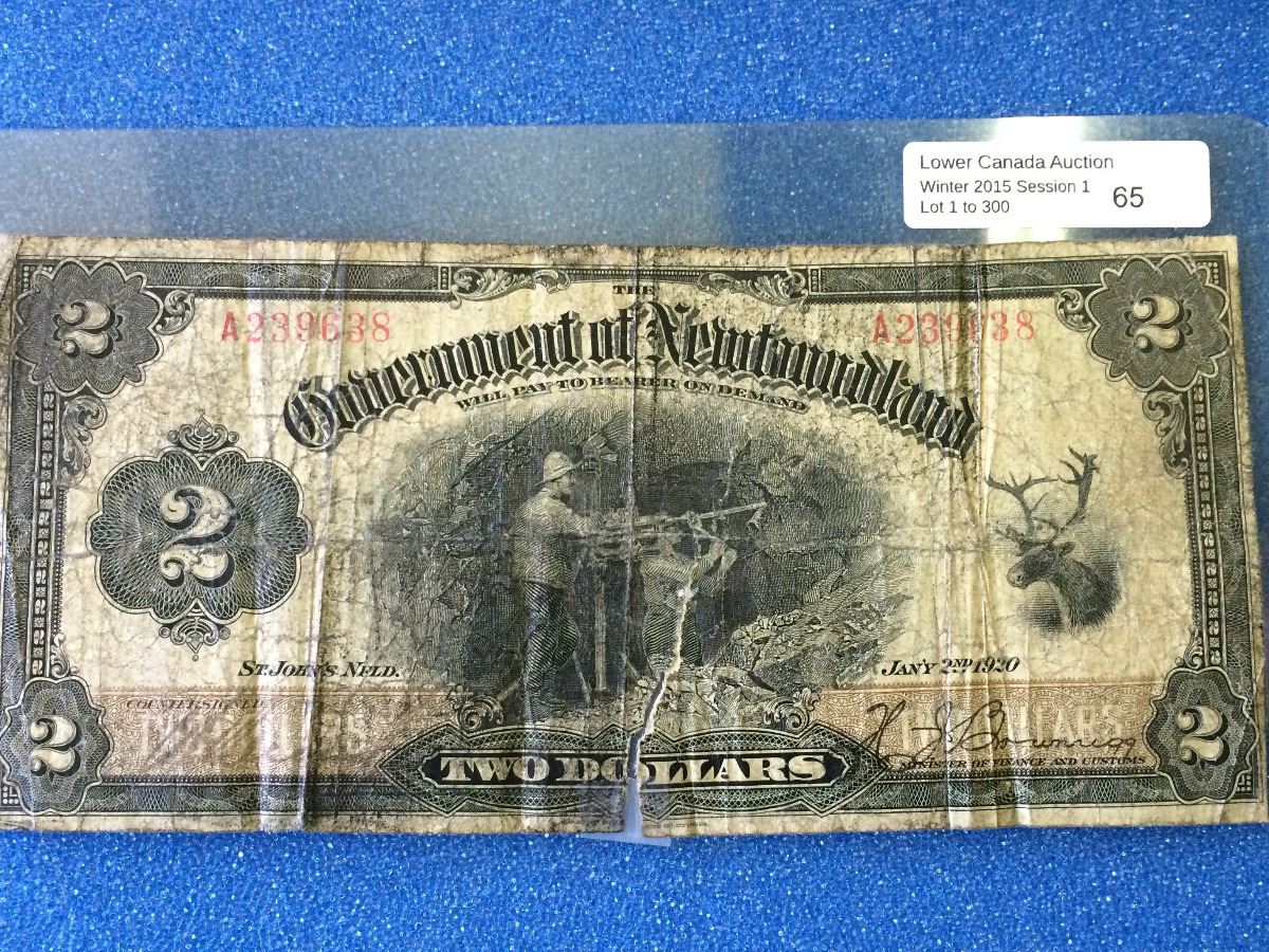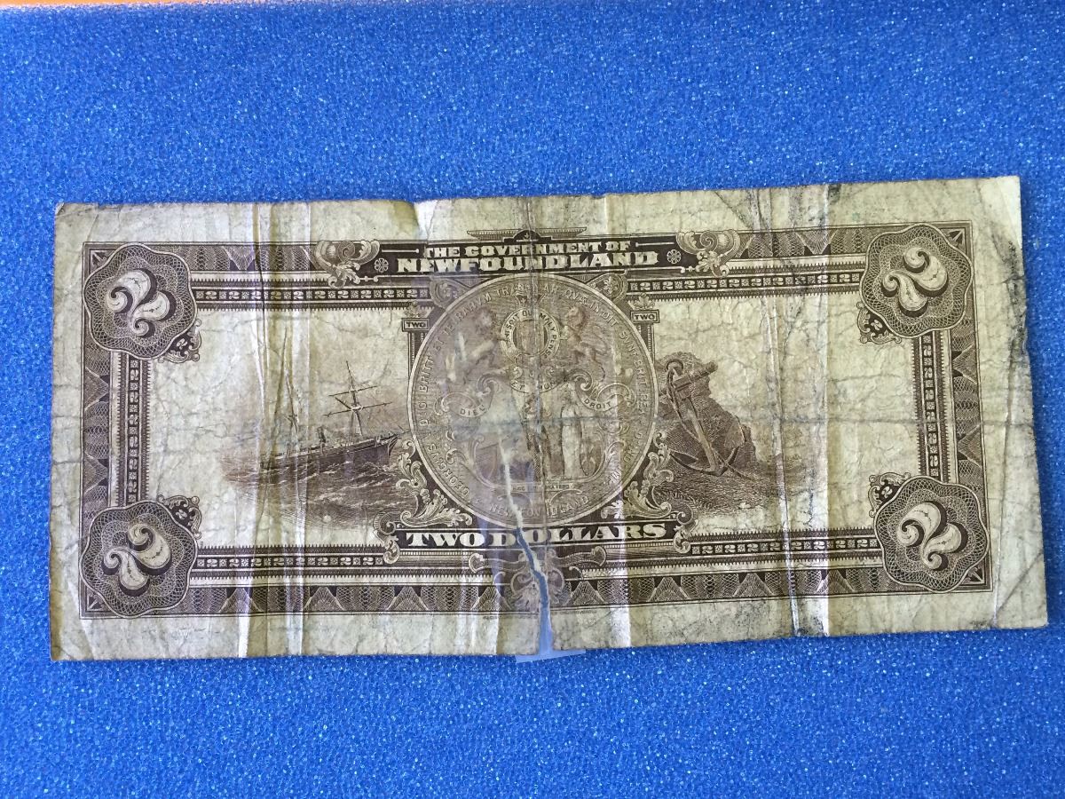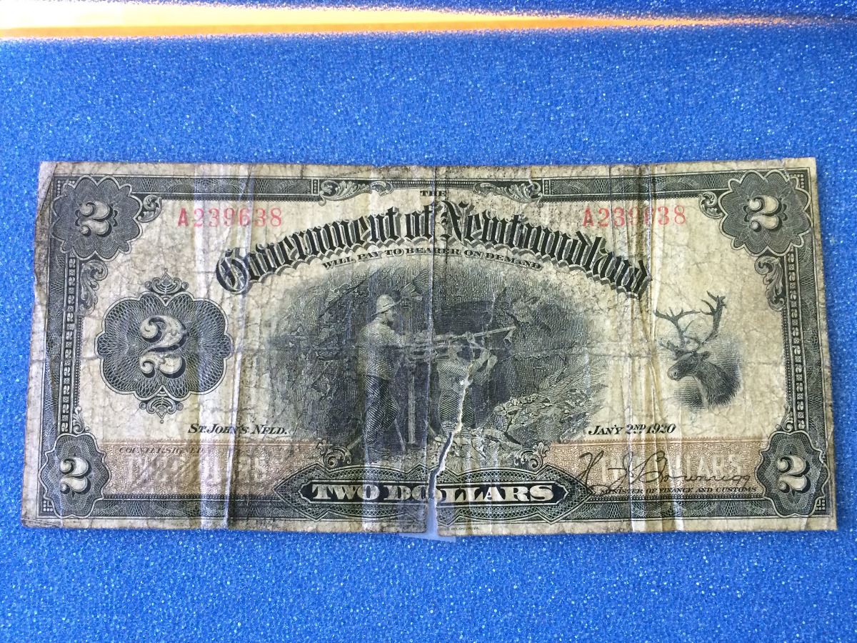 Newfoundland; $2.00 note 1920 NF-13d Renouf Brownrigg A239638 would be VG but in 2 pieces and scotch taped.