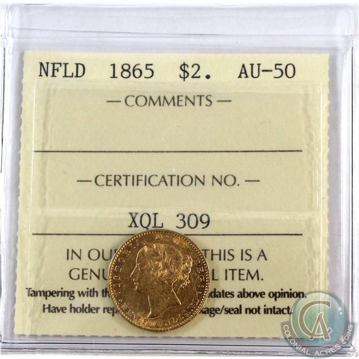 Newfoundland $2 1865 Gold ICCS Certified AU-50. A nice first year issue coin