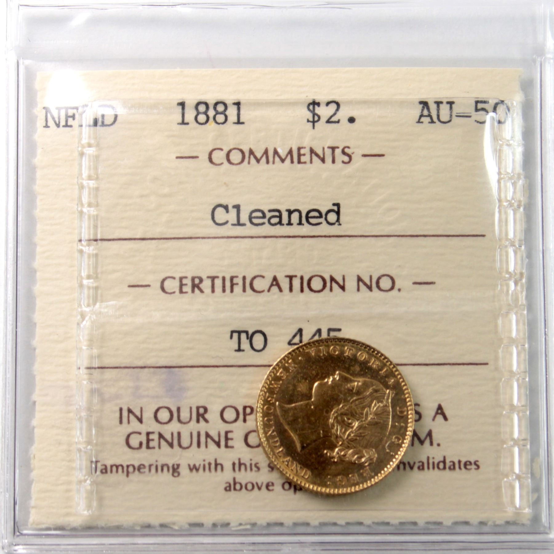 Newfoundland $2 1881 Gold ICCS Certified AU-50 (Cleaned)