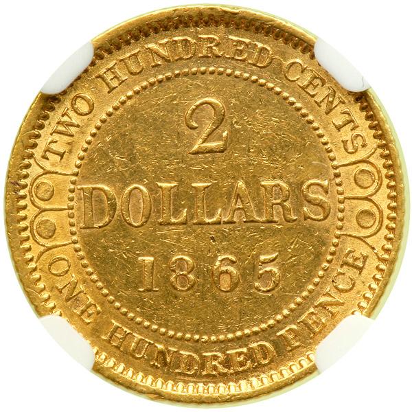 Newfoundland. 2 Dollars, 1865. Fr-1; KM-5. Victoria. Moderate handling marks in the fields. NGC graded AU-50.