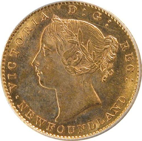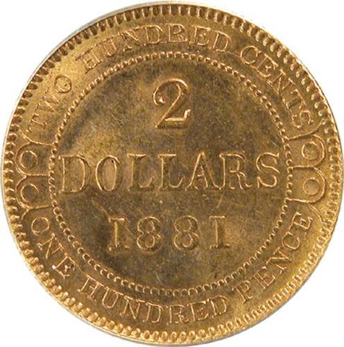 Newfoundland Two Dollars Gold 1881 PCGS MS-64. This is a very well struck piece with great lustre on near flawless surfaces. This is the solo highest graded by PCGS and there are only two graded at the MS-63 level