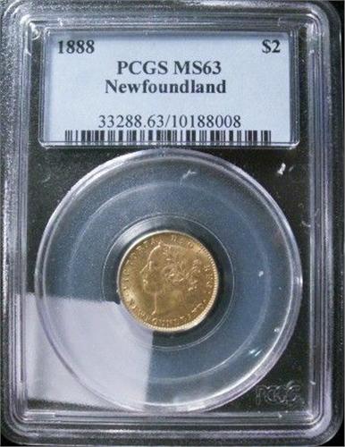 Newfoundland $2 Gold 1888 PCGS MS63. Brilliant and clean fields with satiny lustre.