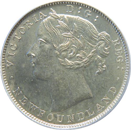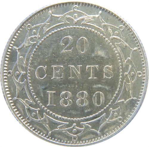 Newfoundland Twenty Cents 1880 ICCS and PCGS MS-63. This is a fully struck, early die state piece with great lustre on rather flawless pale golden toned surfaces that have light cameos on mirror fields. Very rare in mintstate, this is one of only three examples certified by ICCS and PCGS has certified only two others. From the Point Grey Collection