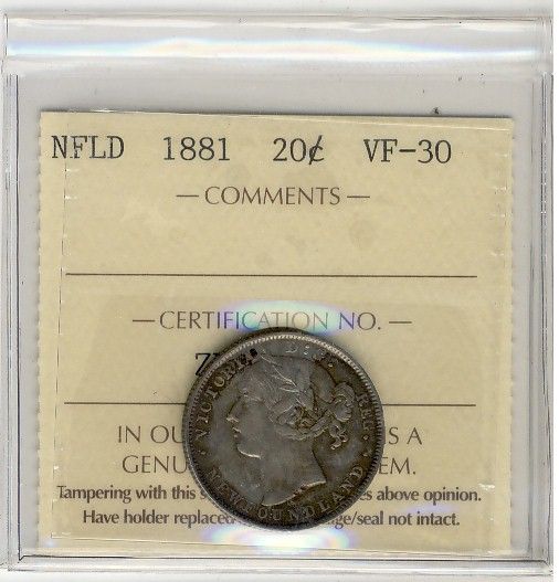 Newfoundland 20 Cents 1881, ICCS VF-30.