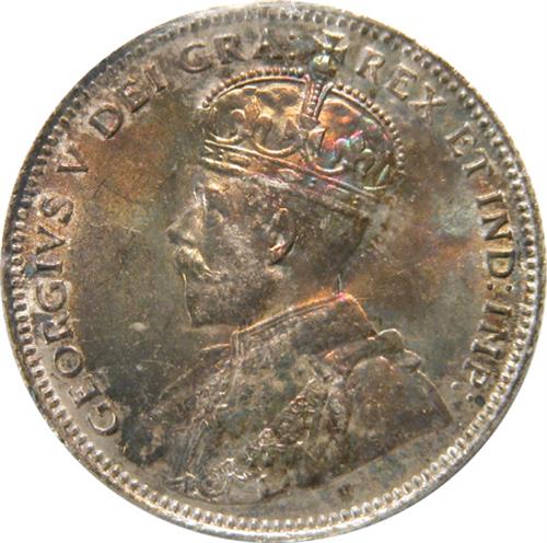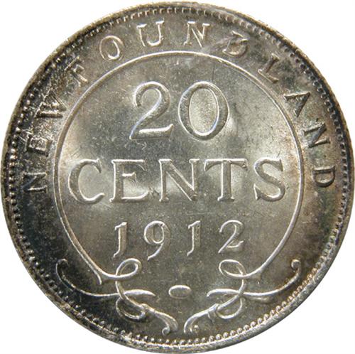 Newfoundland Twenty Cents 1912 ICCS MS-64. This is a fully struck piece with great lustre and rather flawless surfaces that are toned in light orange ambers with iridescent blues, greens and magentas on the obverse and pale centres framed with light-medium olives and blues on the reverse. It is tied as the sixth highest by ICCS
