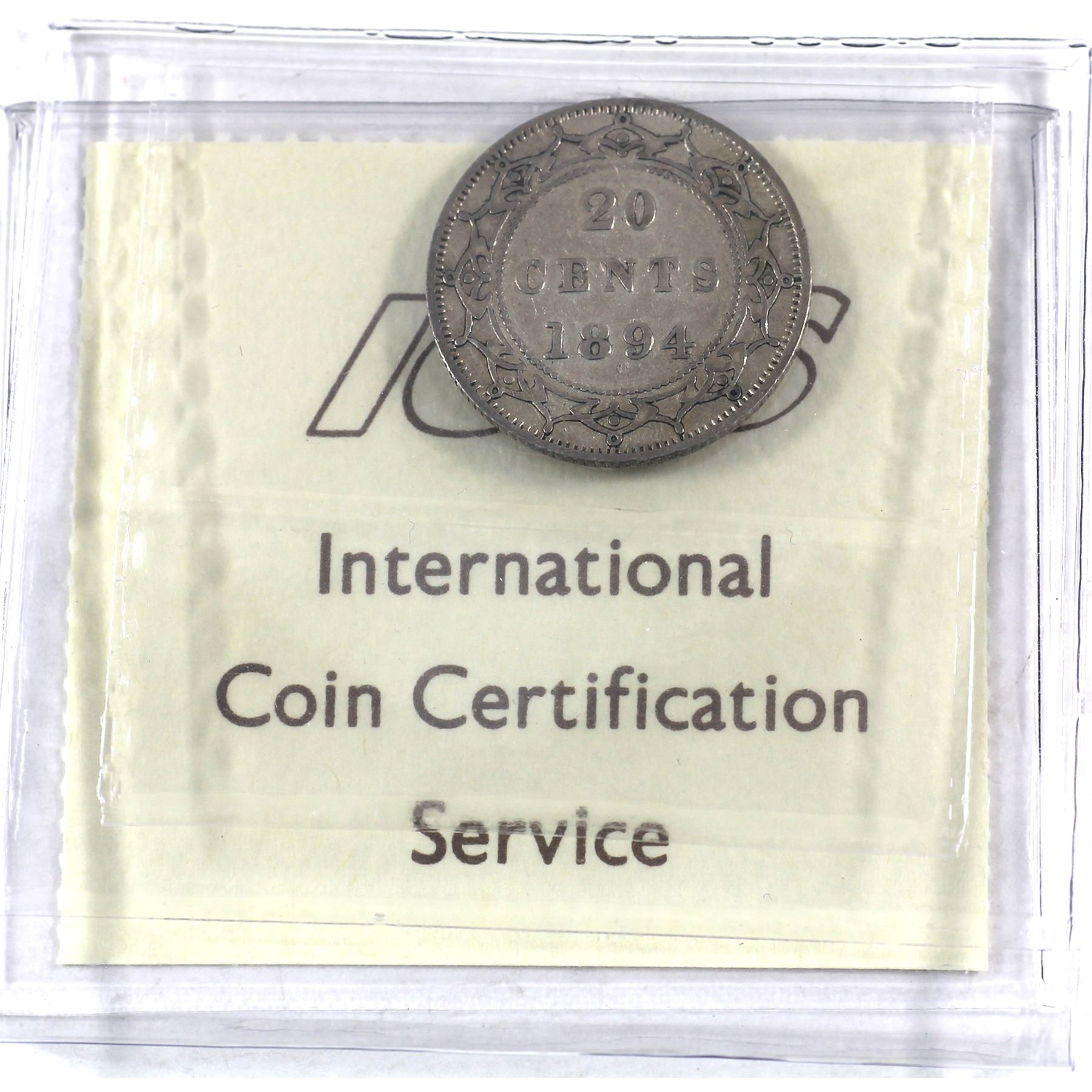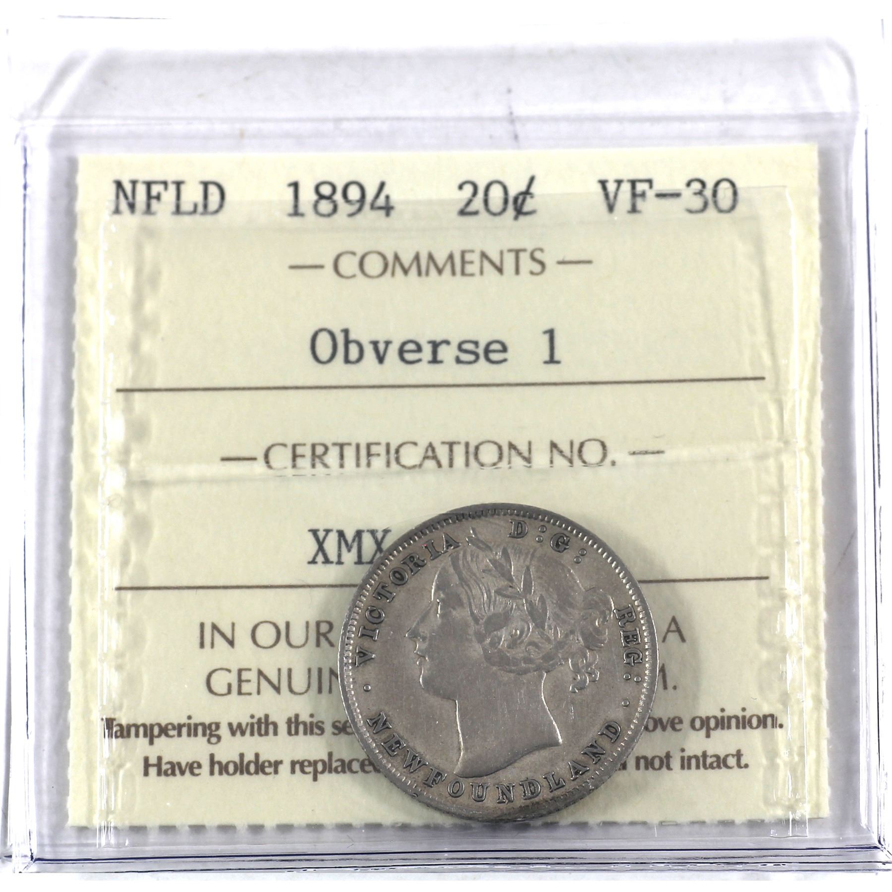 Newfoundland 20-cent 1894 Obv. 1 ICCS Certified VF-30