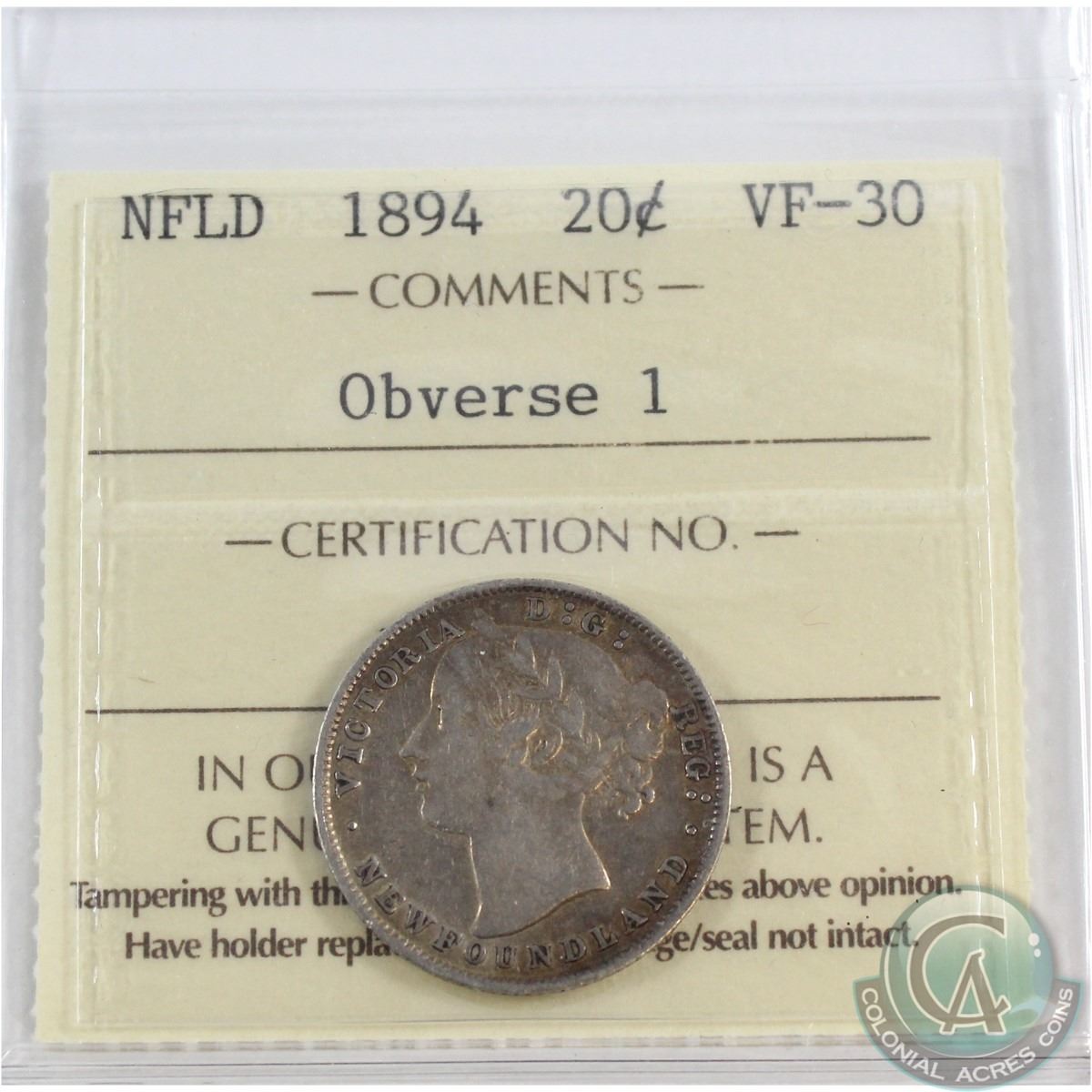 Newfoundland 20-cent 1894 Obverse 1 ICCS Certified VF-30