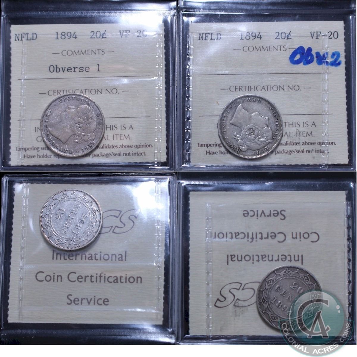 Newfoundland 20-cent 1894 Obverse 1 & Obverse 2 ICCS Certified VF-20. 2pcs