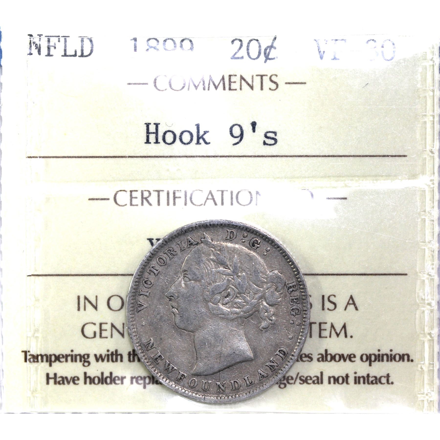 Newfoundland 20-cent 1899 Hook 9's ICCS Certified VF-30.