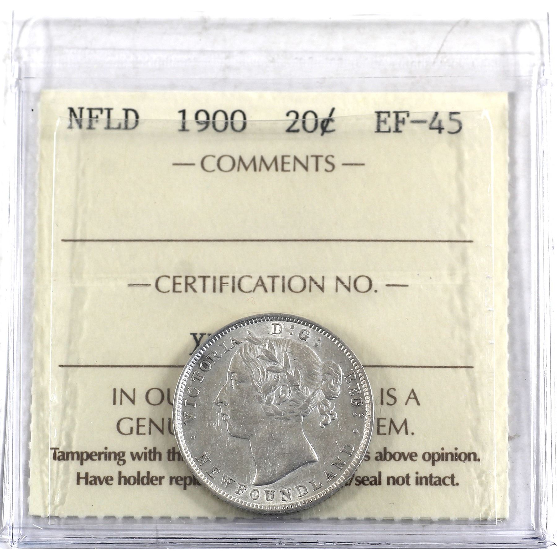 Newfoundland 20-cent 1900 ICCS Certified EF-45. Bright attractive coin with mint luster throughout the margins.
