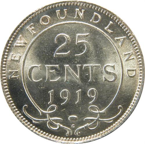 Newfoundland Twenty-Five Cents 1919C ICCS MS-63 PQ. This is a fully struck piece with great lustre and rather flawless surfaces that are very attractively toned in pale golds. It is tied with three as the highest by ICCS. From the Point Grey Collection