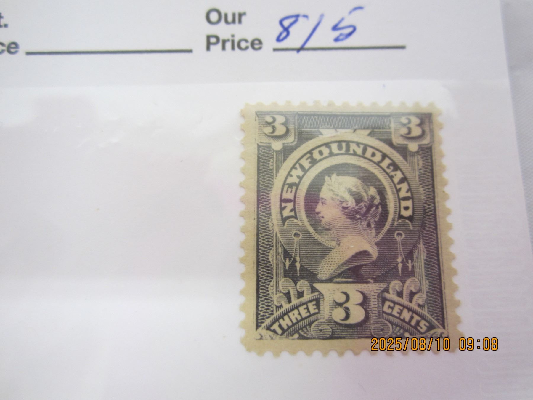 Newfoundland 3 Cent Victoria OG Never Used