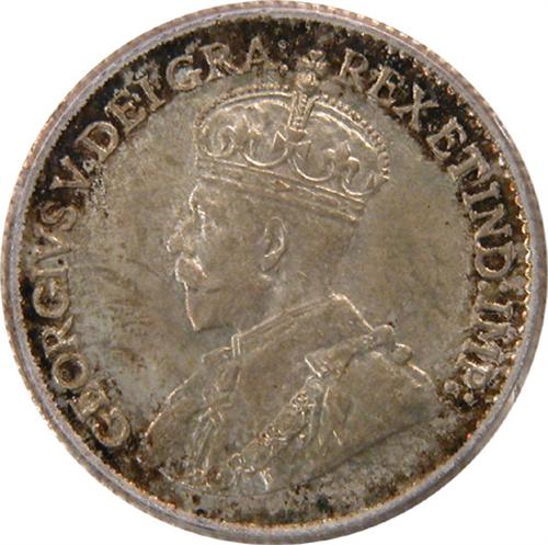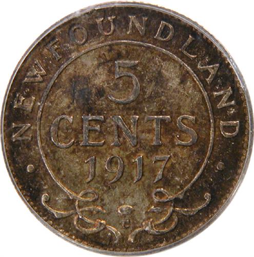 Newfoundland Five Cents 1917C PCGS MS-63. A fully struck and nicely lustrous piece with toning in light-medium golds, ambers and russets. It is tied as the seventh highest by PCGS
