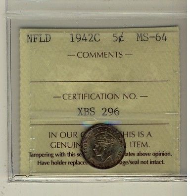 Newfoundland 5 Cents 1942C, ICCS MS-64.