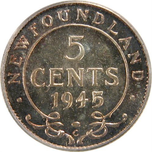 Newfoundland Five Cents 1945C PCGS MS-65. A fully struck and superbly lustrous piece with very attractive toning in pale gold with light ambers and russets toward the rims