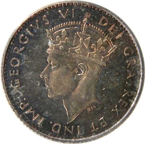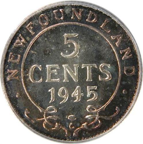 Newfoundland Five Cents 1945C PCGS MS-66. Superbly lustrous and near flawless with very attractive light-medium amber toning. It is tied as the fourth highest graded by PCGS