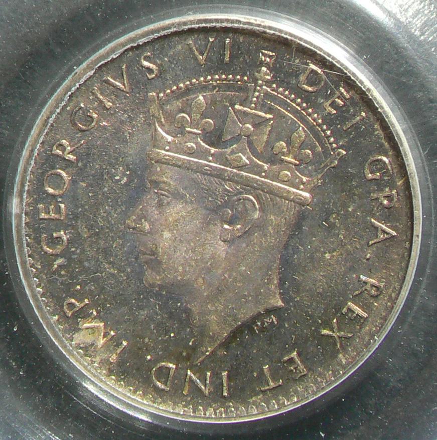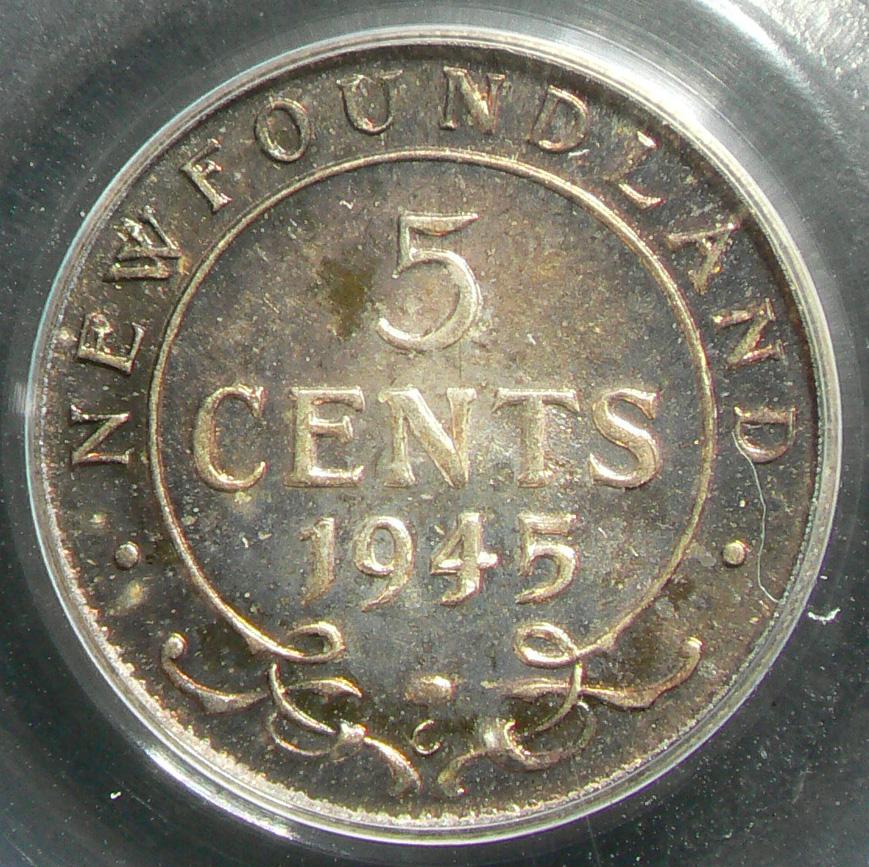Newfoundland 5 Cents 1945C, graded PCGS MS-66. Purple tonig and great lustre.