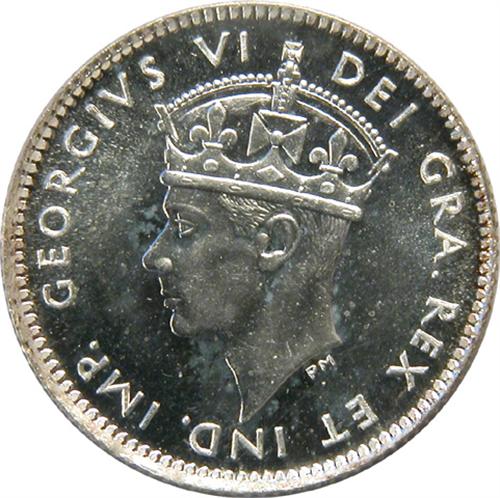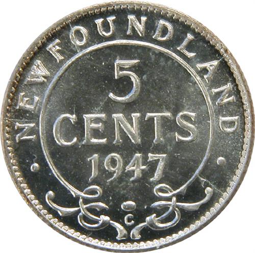 Newfoundland Five Cents 1947C ICCS MS-67. This is a fully struck and superbly lustrous piece with virtually flawless surfaces that have a very pale golden rim toning. It is the solo highest graded by ICCS and none is graded higher than MS-66 by PCGS. From the Point Grey Collection