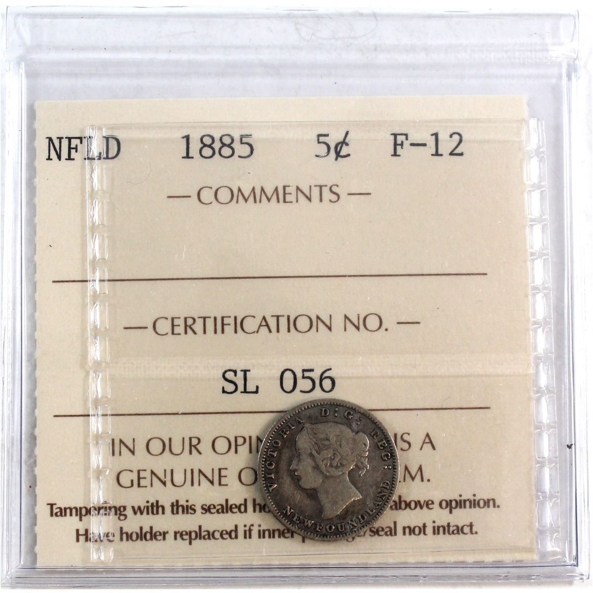 Newfoundland 5-cent 1885 NFLD ICCS Certified F-12. A Nice soft grey patina.*Key Date*