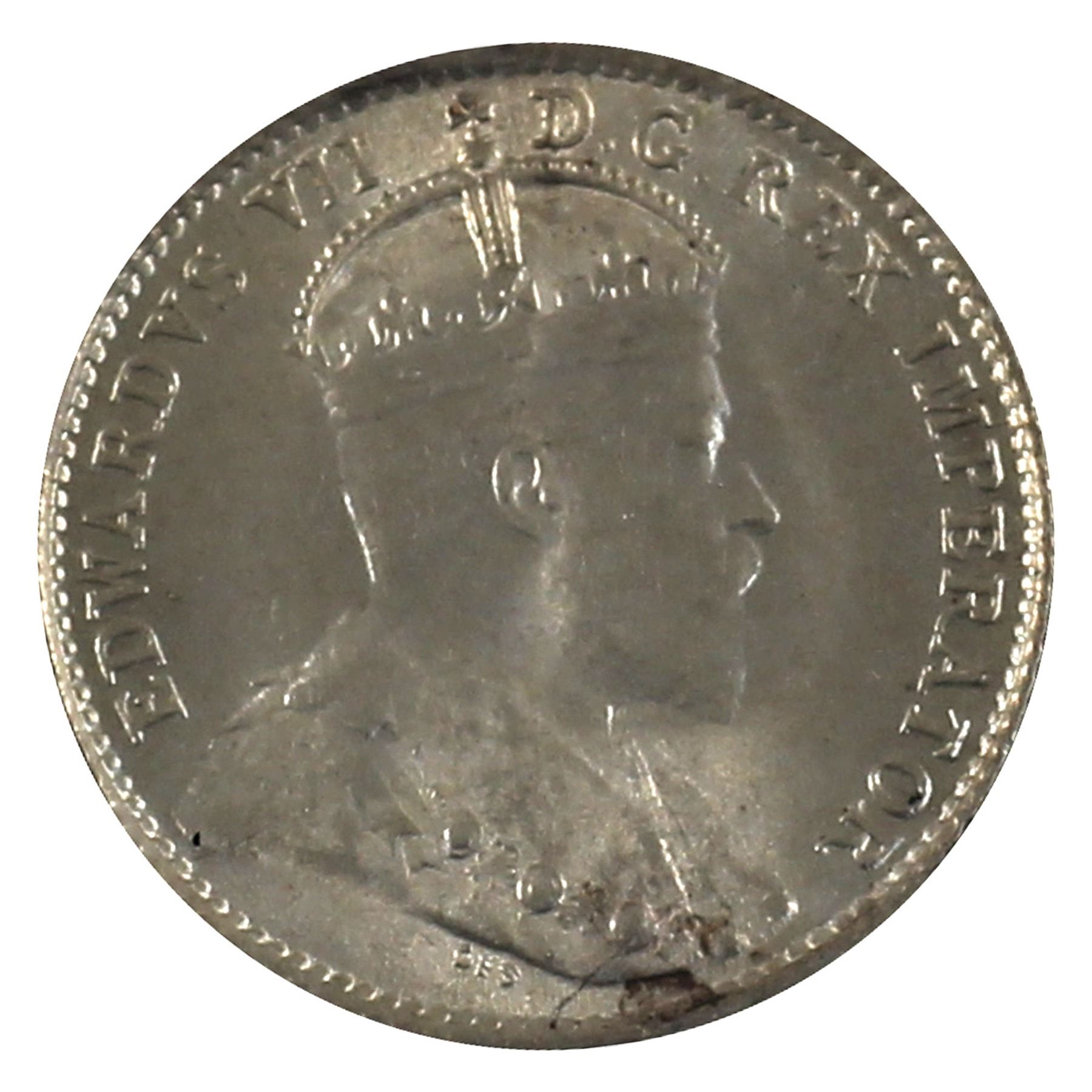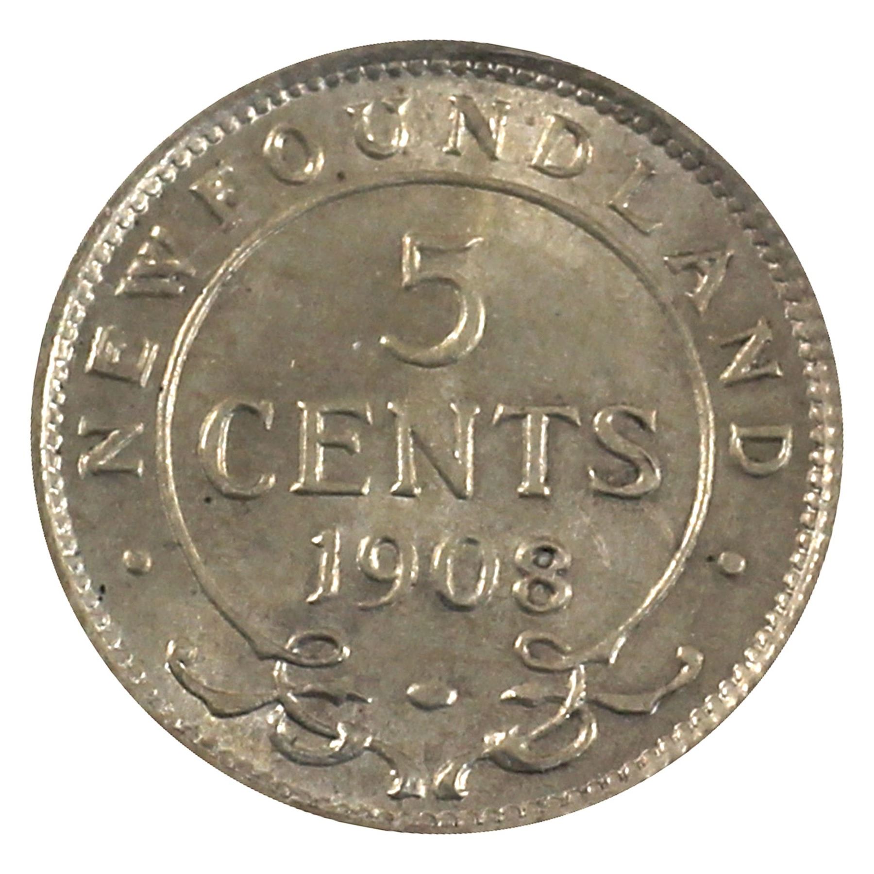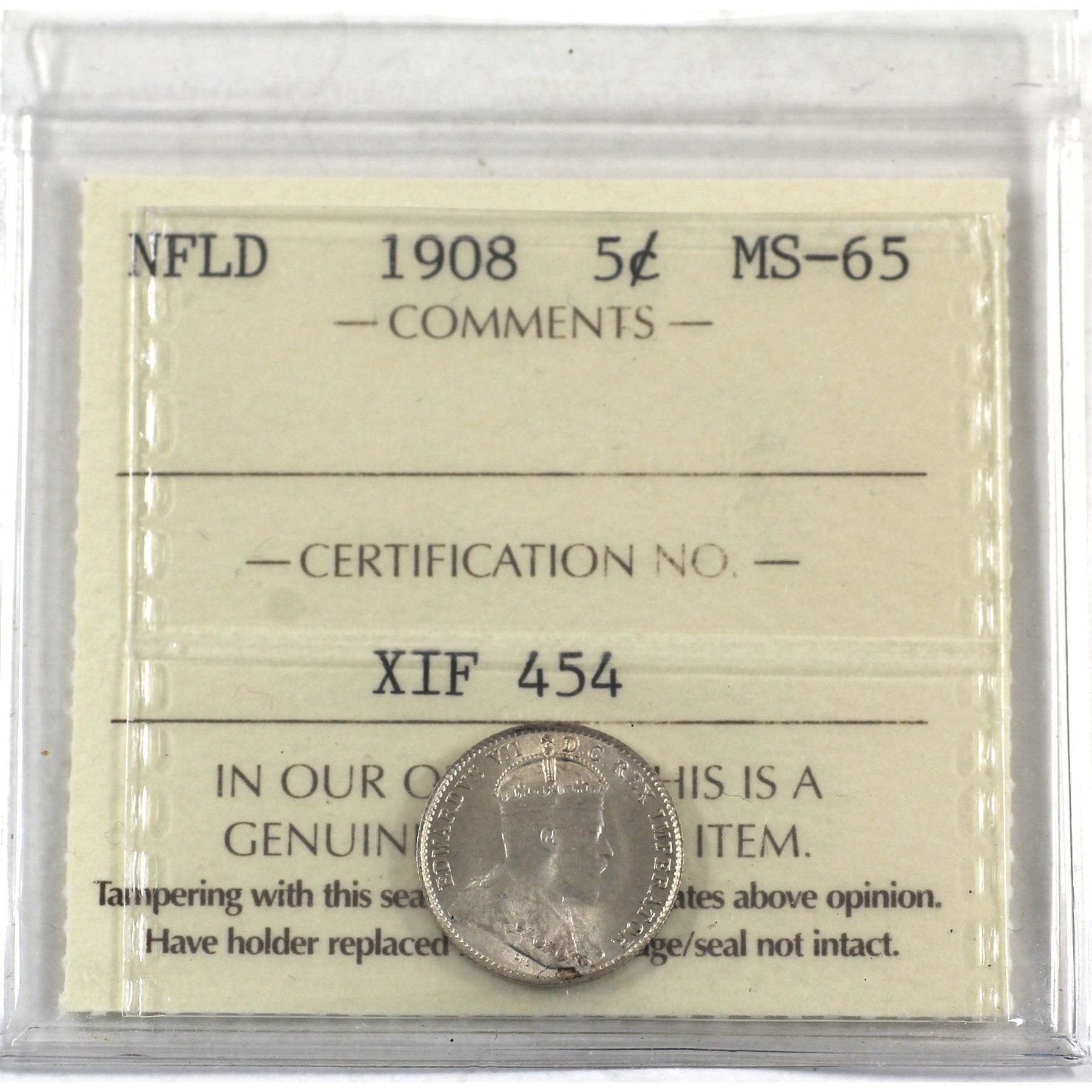 Newfoundland 5-cent 1908 ICCS Certified MS-65. A lustrous coin with hints of golden toning.