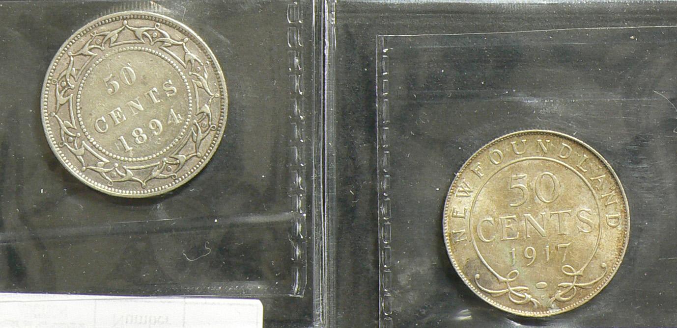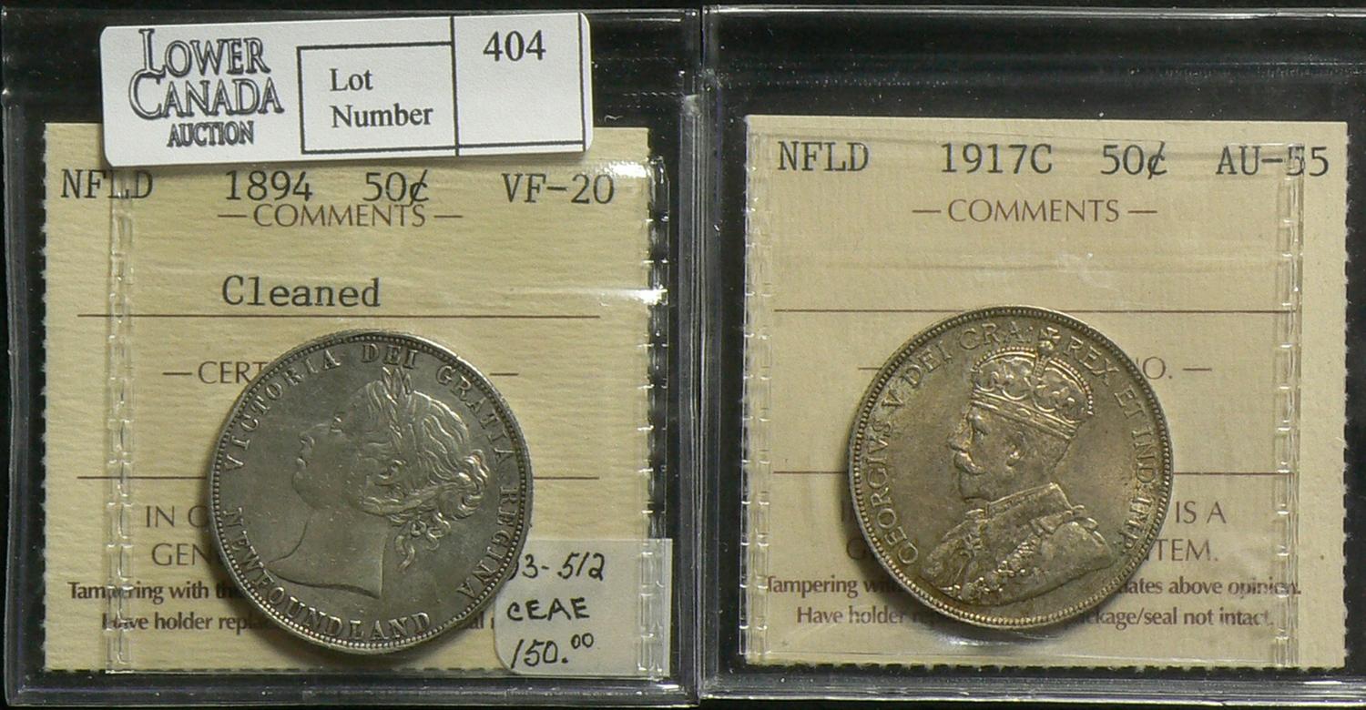 Newfoundland 50 Cents 1894, graded ICCS VF-20 cleaned, 1917C, graded ICCS AU-55. Lot of 2 coins.
