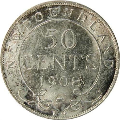 Newfoundland Fifty Cents 1908 Choice Uncirculated. This is a fully struck and strongly lustrous piece with pale golden toning