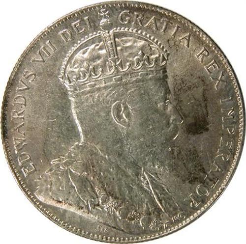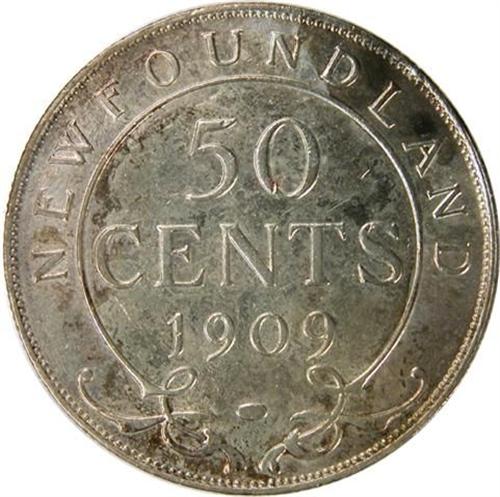 Newfoundland Fifty Cents 1909 AU-Uncirculated. Near fully lustrous with a pale golden toning