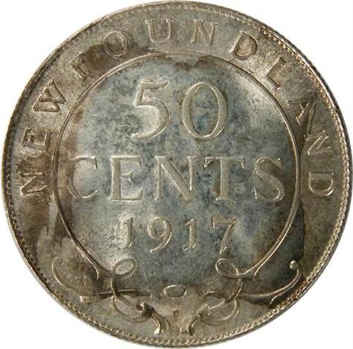 Newfoundland Fifty Cents 1917C Uncirculated. A fully struck and nicely lustrous, pale golden toned piece
