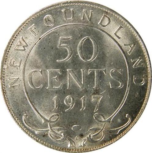 Newfoundland Fifty Cents 1917C Uncirculated. A fully struck and nicely lustrous, pale golden toned piece