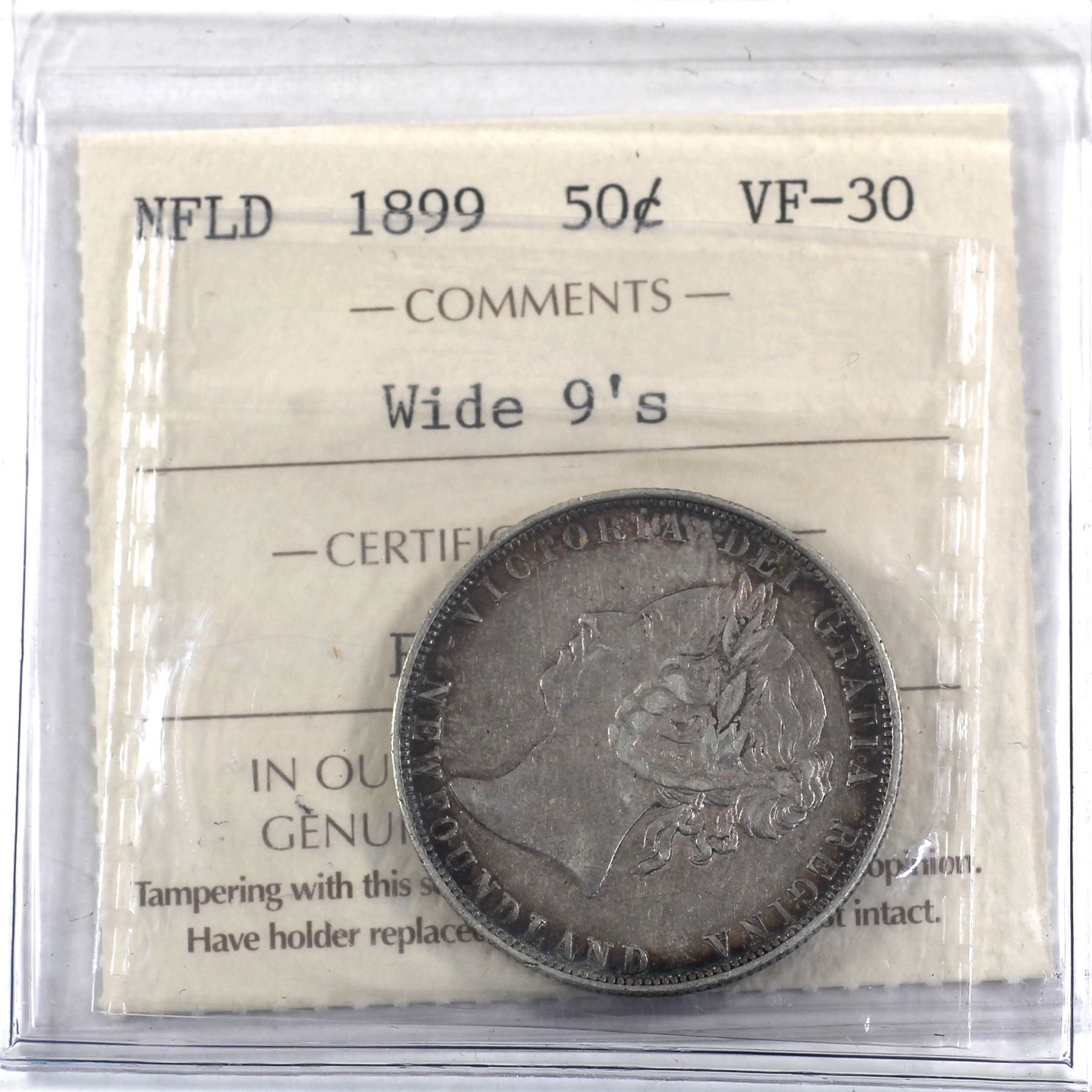 Newfoundland 50-cent 1899 Wide 9's ICCS Certified VF-30.
