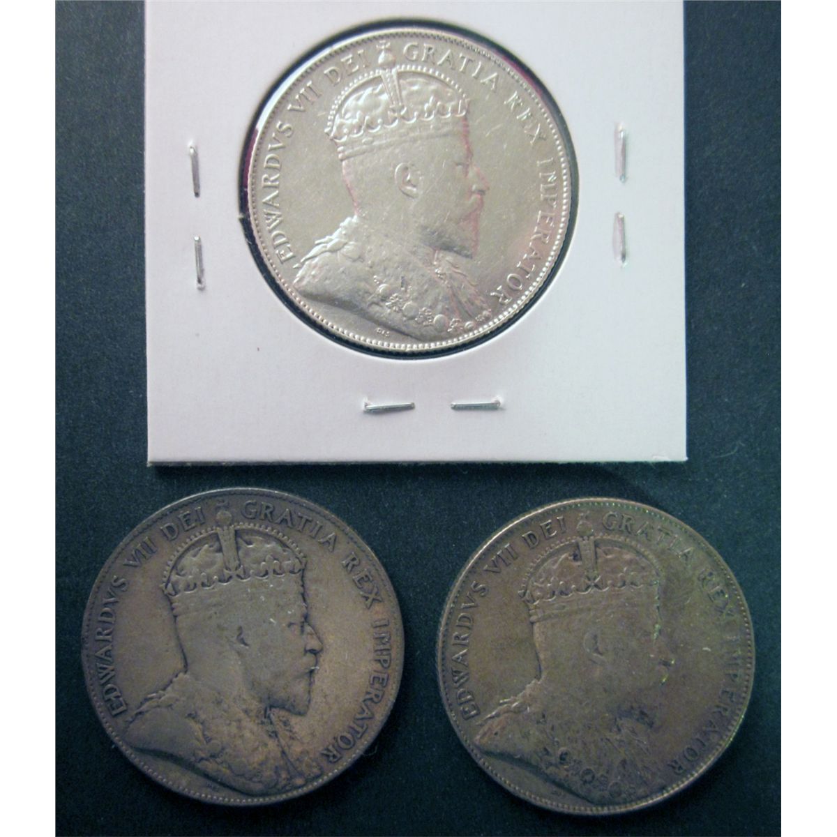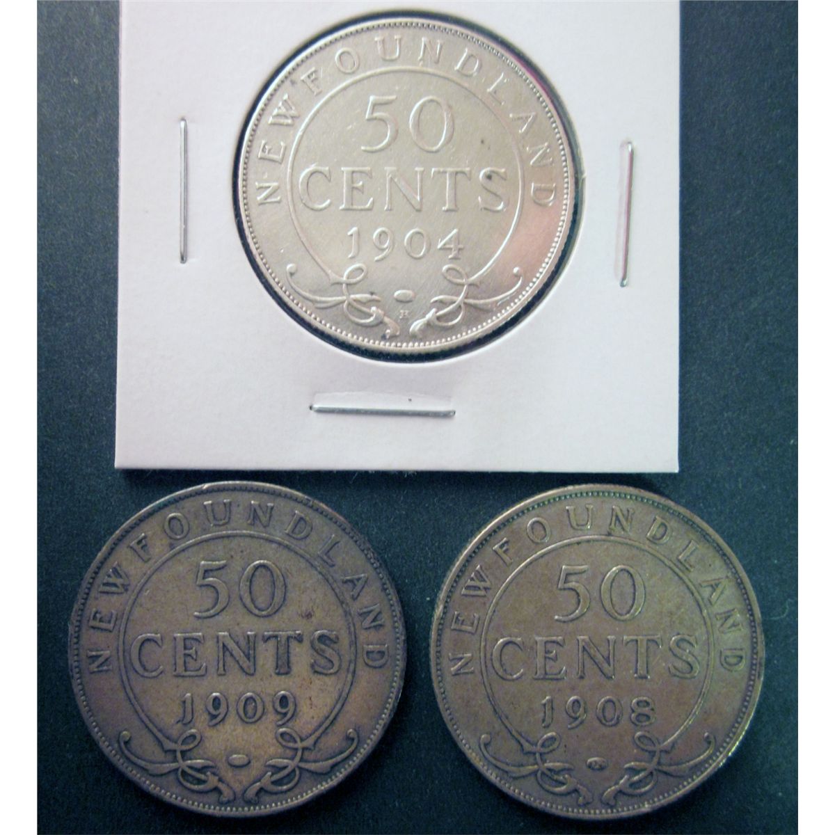 Newfoundland 50 cents 1904H in VF-30; Cleaned, 1908 in VF-30 & 1909 in F-15. Lot of 3 coins.