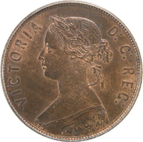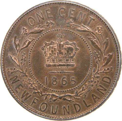 Newfoundland Large Cent 1865 PCGS MS-64 Red and Brown. This is a very well struck piece with just the a bit of the typical weakness on the crown on the reverse. It is strongly lustrous and has rather flawless surfaces that are a rich mahogany that is about 20% red