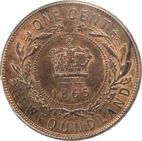Newfoundland Large Cent 1865 PCGS MS-65 Red and Brown. This is a very well struck piece with just the slightest bit of the typical weakness on the crown on the reverse. It has strongly lustrous and rather flawless surfaces that are about 50% red. It is tied with four others as the highest Red and Brown with only four MS-65 Reds higher by PCGS