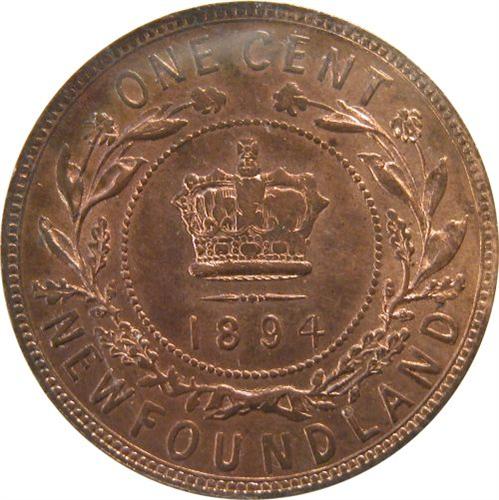 Newfoundland Large Cent 1894 ICCS MS-64 Red and Brown. This is a very well struck piece with a bit of the typical weakness on the crown on the reverse. It has strongly lustrous and near flawless surfaces that are about 65% red and it is tied with four others as the highest graded by ICCS