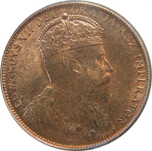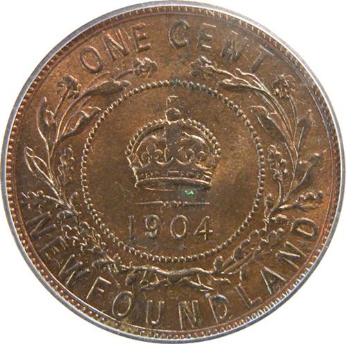 Newfoundland Large Cent 1904H ICCS and PCGS MS-64 Red and Brown. This is a strongly struck piece with a bit of the typical weakness on the crown on the reverse. It has great lustre on near flawless surfaces that are about 40% red with wonderful iridescent overtones of golds and blues. It is tied with two others as the second highest graded by ICCS and there are three 64 Reds and none higher by PCGS