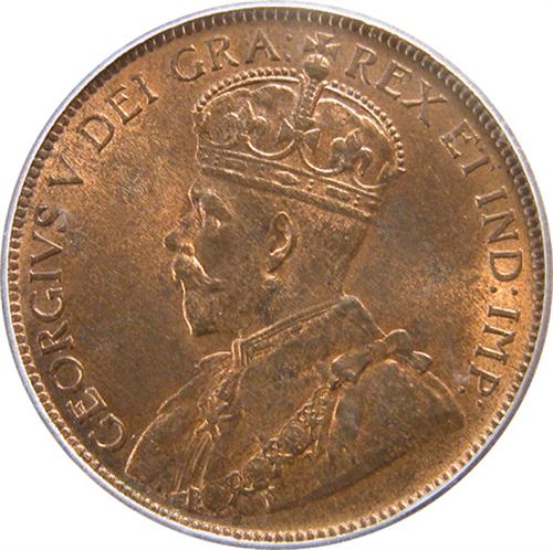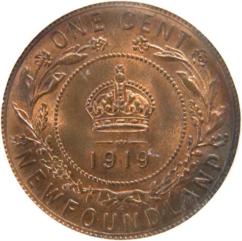 Newfoundland Large Cent 1919C ICG MS-66 Red and Brown. This is a virtually fully struck piece with nicely lustrous and near flawless surfaces that are about 50% red