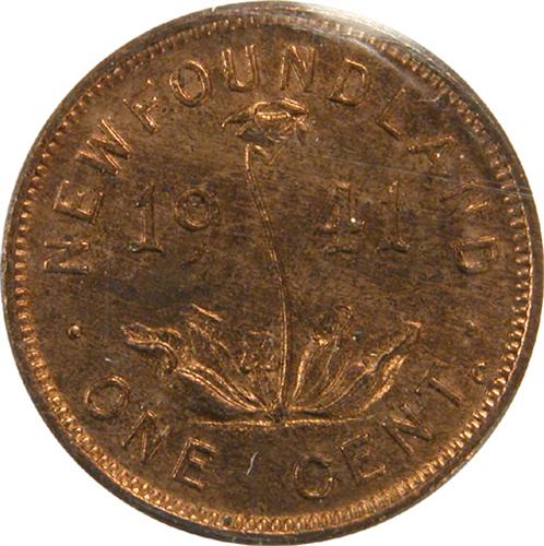 Newfoundland Small Cent 1941C ICCS MS-63 Red. Fully struck and strongly lustrous with about 70% red. It is tied with four others as the second highest by ICCS