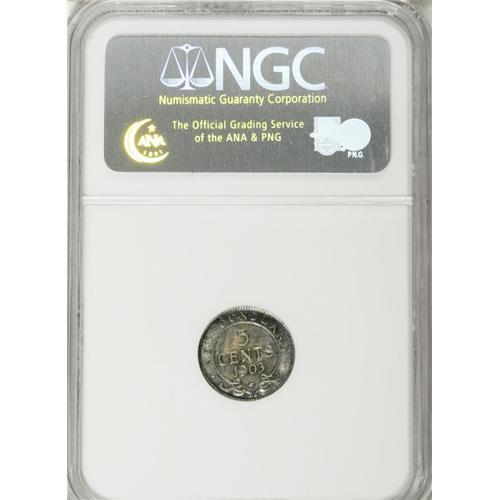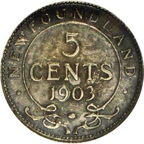 <B>Newfoundland. Edward VII 5 Cents 1903, </B></I>KM7, MS62 NGC, deep blue-gray patina with very sharp design details. This date is very scarce in Mint State.<BR><BR><b>Shipping:</b> Coin/Currency (<a target="_blank" href="http://www.heritageauctions.com/common/shipping.php">view shipping information</a>)