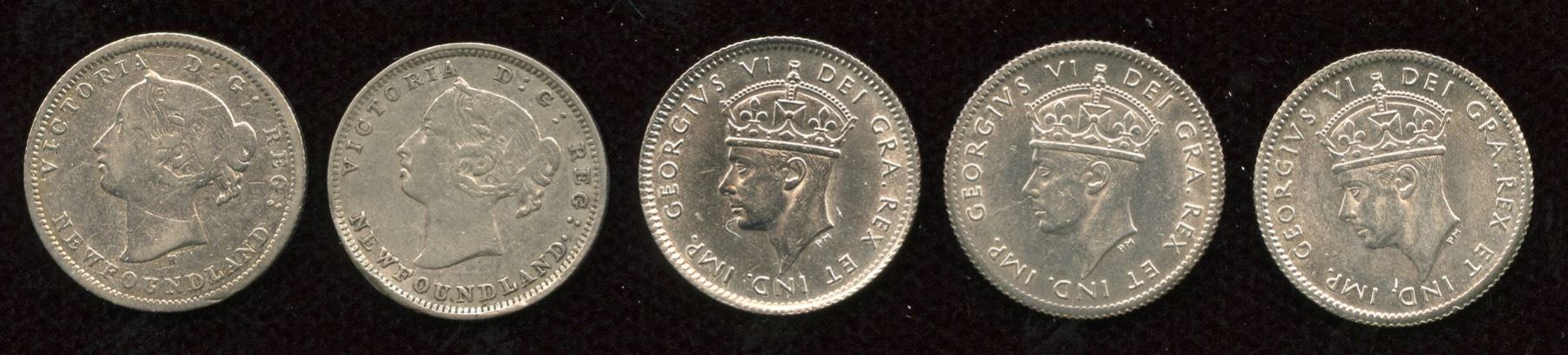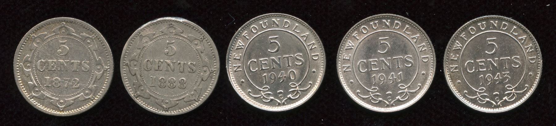 Includes: 1872H Five Cents, Fine. 1888 Fine. 1940 BU. 1941 AU/Unc. 1943 BU. 5 Pcs.