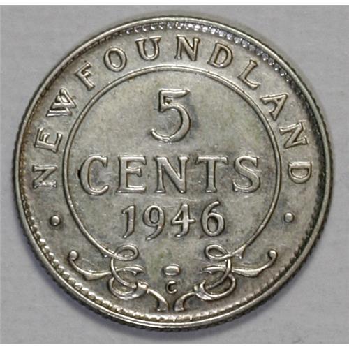 <B>Newfoundland George VI 5 Cents 1946C, </B></I>KM19a, XF, few tiny surface marks, key date.