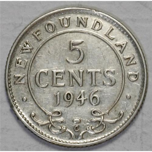 <B>Newfoundland George VI 5 Cents 1946C, </B></I>KM19a, nice XF, one noticeable rim bruise, scarce low mintage date.